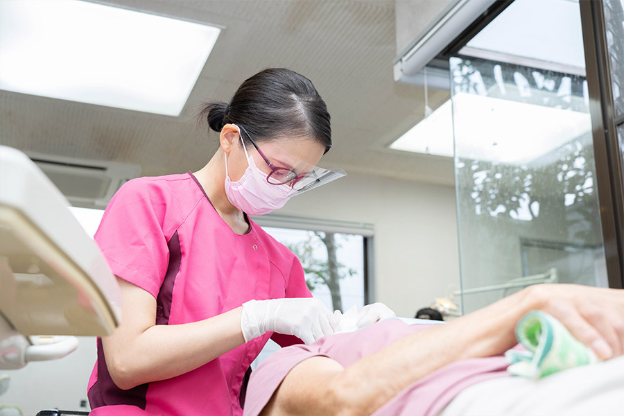 主に、歯科衛生士が行います。PMTCはセルフケアでは落としきれない歯の表面の歯石除去や、歯ブラシが届きにくい部分の清掃を行うものです。